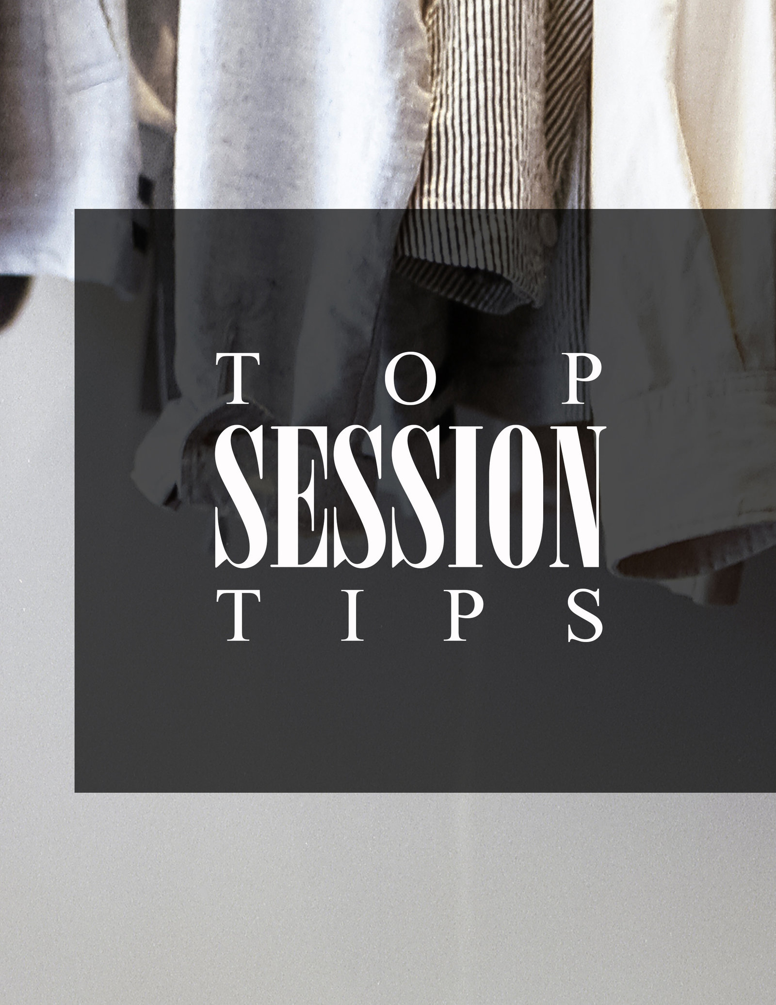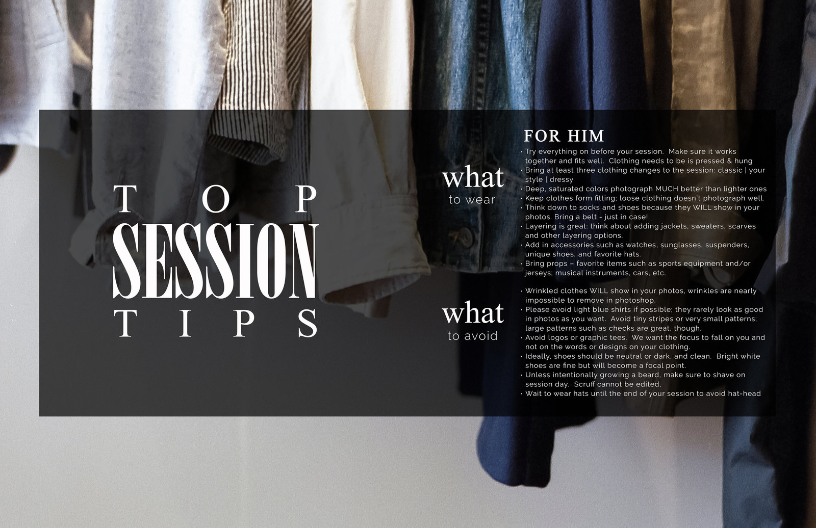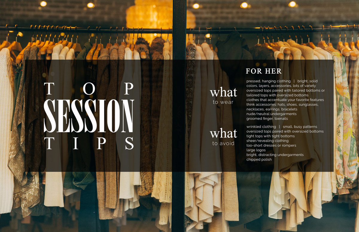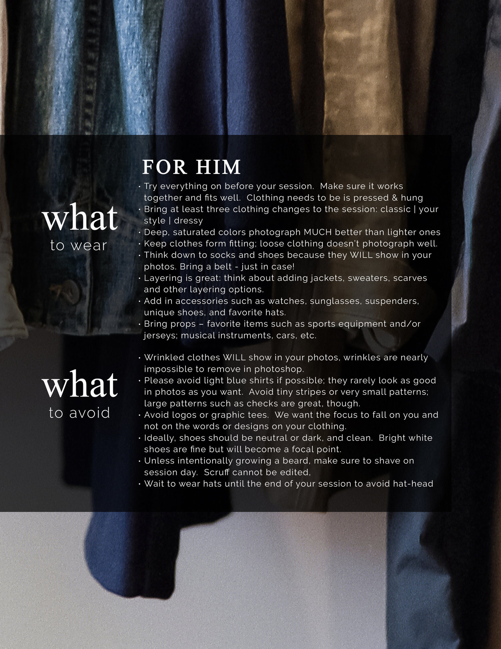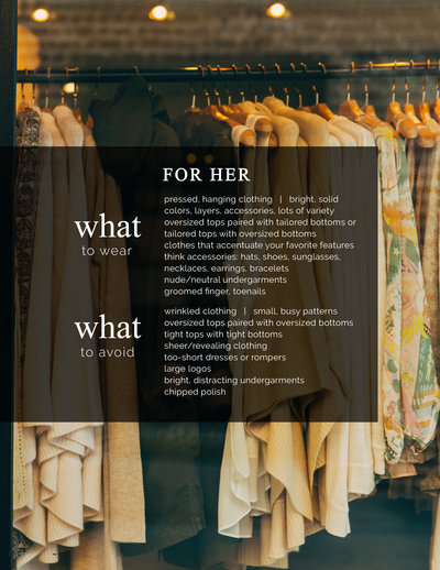 If you are having your photos done in the Spring or Summer lean towards light tones such as light blues, creme, white, light pinks. If you are in the Fall or Winter think warmer tones, like burnt orange, dark blues and maroon. Feel free to look at my pinterest boards for ideas. Avoid wearing all white or all black. White can wash your skin tone out and black can make you disappear. We want you to pop in the images, so try to avoid all white or all black dresses or shirts. Snap some iPhone pics and text them to me.