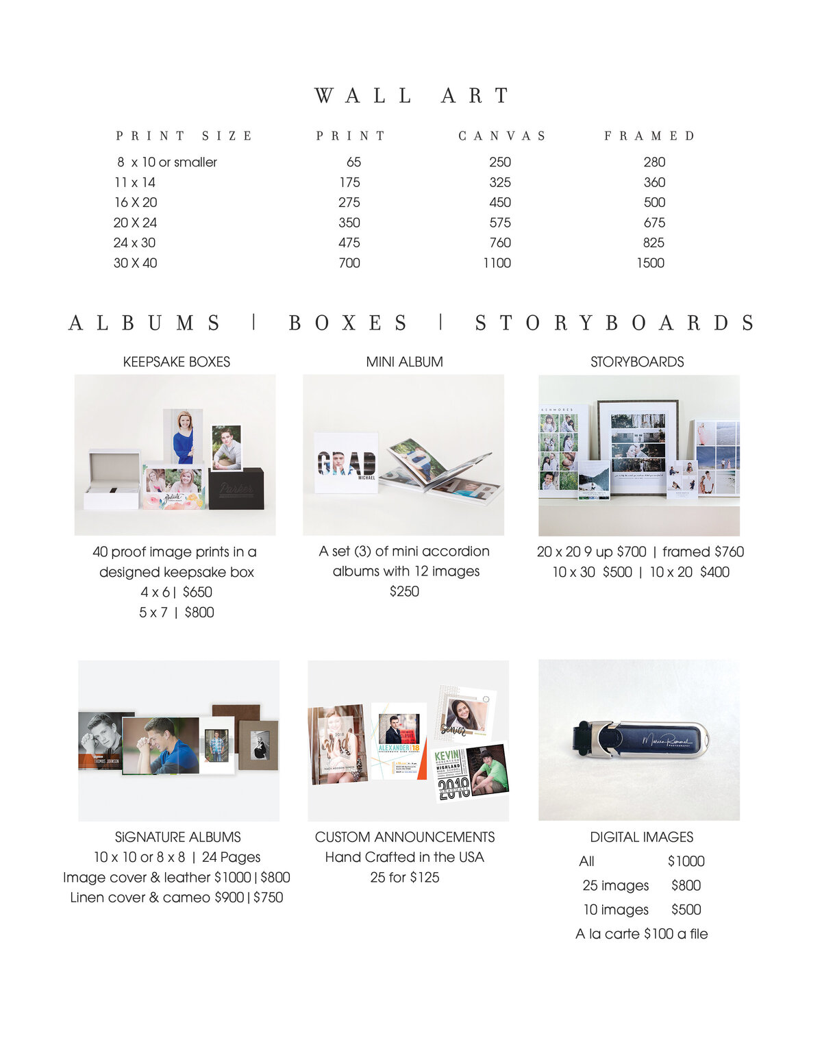 Includes: pre-session style consultation by text and phone, session in the studio or outdoor location, and an in person viewing and ordering appointment